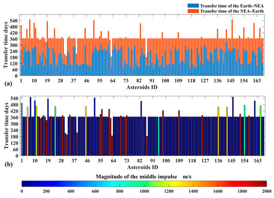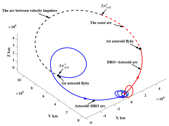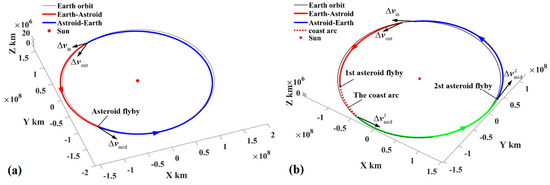 This study is focused on the exploration of potentially hazardous asteroids (PHAs), a class of NEAs whose heliocentric orbits pass through the orbit of the Earth. PHAs may cause unforeseen impact threats to the Earth. Currently, thousands of PHAs have been discovered and tracked, but their precise long-term orbital prediction is still challenging due to the lack of sufficient physical information about these PHAs. In recent years, the missions to change the orbits of PHAs have been proposed and implemented. NASA once proposed the Asteroid Redirection Mission (ARM), in which an asteroid boulder is captured and redirected to cislunar space, where it will be landed by a manned spacecraft [7]. In addition, a series of studies have been conducted on designing low-energy trajectories of asteroid capture [8,9,10,11,12,13]. Most recently, the DART (Double Asteroid Redirection Test) spacecraft successfully collided with the asteroid “Dimorphos”, which is the moon of the asteroid “Didymos,” on 26 September 2022, successfully changing the relative orbit of Dimorphos around Didymos [14].