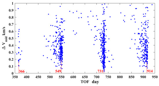 Consequently, the lower bound of the required velocity increment (denoted as ) at the three featured states with respect to is computed straightforwardly, as shown in Figure 5. It is noted that the exerted at the perigee to match is much lower than those exerted at the other two featured states, and therefore, the case with the escape maneuver at the perigee is considered in the following trajectory design.