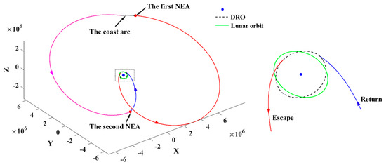 Schematic diagram of PHA exploration mission (the red, magenta and black lines denote the single round trip, lunar orbit and DRO, respectively).