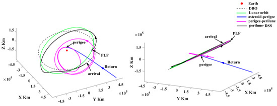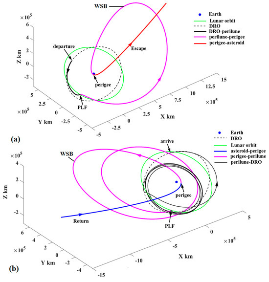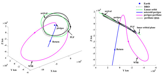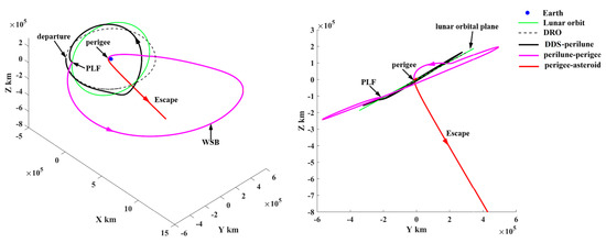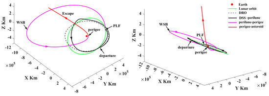 In Figure 24, the depart/return trajectory from/to the cislunar space presents a large angle to the lunar orbital plane. However, the probe uses the PLF and WSB ballistic arc to change the inclination relative to the lunar orbital plane, as shown by the magenta trajectories in Figure 25 and Figure 26. Therefore, in order to explore more PHAs, especially the PHAs with large inclinations, the PLF and WSB should be introduced to the orbital design because these two strategies can launch the probe into deep space in more directions.