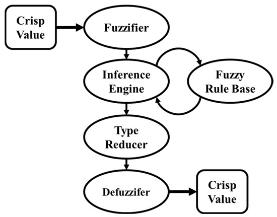 For the methodology proposed here, the Type-Two Fuzzy Logic system was selected due to its ability to handle uncertainties and variations in aircraft dynamics. The Type-Two Fuzzy Logic System consists of the following 5 components [36]: (1) Fuzzifier, (2) Inference Engine, (3) Fuzzy Rule Base, (4) Type Reducer, and (5) Defuzzifier. A simplified architecture of a Type-Two Fuzzy Logic System is illustrated in Figure 2.