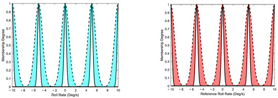 Initially, the inputs must be fuzzified by a membership function showing the membership degree of an input value to a fuzzy set. In this Type-Two Fuzzy Logic System, for each input variable, such as the roll rate and its reference signal , lower and upper membership functions were defined to compose a region called a “Footprint of Uncertainty (FOU)”, as shown in cyan and red colours in Figure 3. The definition of these membership functions improves the handling of uncertainties compared to the single membership function used in Type-One Fuzzy Logic Systems [37].