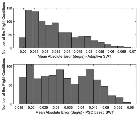 In Equation (11a), and are two positive constants whose values were determined using two different approaches. Initially, we employed an adaptive control methodology to continuously adjust its parameters during the simulation. In this approach, the two parameters were increased until the aircraft state variables reached the sliding surface, and then they decreased over time [31]. The second approach is to employ the Particle Swarm Optimization (PSO) algorithm to find optimal values for and , as well as in Equations (10) and (11a).