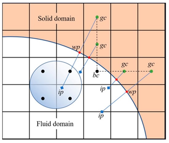 The virtual element method [38,39,40,41,42,43,44,45,46,47] is adopted in the immersed boundary method based on a Cartesian grid. The grid element is arranged outside the boundary of the flow field in the virtual element method. According to the boundary condition and the value of the nearby flow field, the specific values are assigned as the difference format template of the flow field grid element around the boundary. Usually, with the help of the mirror point of the virtual point about the boundary, the value of the virtual point is solved by interpolation, as shown in Figure 1. Black points are the center of fluid cells or boundary-fluid cells, green points are ghost cell centers, red points are wall points, and blue points are image points. The black points in the circle are the stencils of inverse distance interpolation for the ip in the same circle. The determination of the solution domain, the generation of surface mesh, the generation of volume mesh, and the determination of the virtual unit for the flow field can be referred to [19]. The boundary types of the flow field are the sliding wall boundary (the inner wall of both the combustion chamber and nozzle), the pressure outlet boundary (the nozzle outlet), the mass flow inlet boundary (the burning surface of propellant grain) and the rotational periodic boundary (the oxy cross-section and oxz cross-section). All boundaries are handled by the immersed boundary method, and the key is to solve the flow field variables on the virtual unit. The virtual cell is taken as the template point in grid cells around the flow field boundary to solve the numerical flux at the cell boundary. The solution method of flow field variables corresponding to virtual units of each boundary is given in the following.