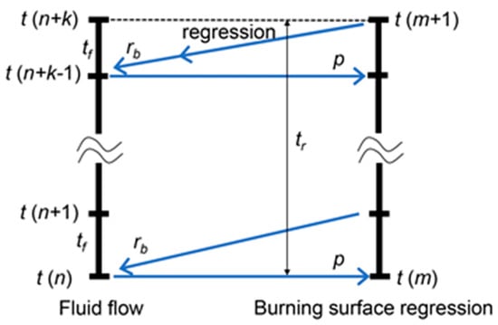 In the solid rocket motor, the gas flow rate is as high as 103 magnitude, while the burning face regression speed is not greater than 10−2 magnitude. Therefore, the difference between the two orders of magnitude is 105, and the time scale of gas flow is far less than that of the burning face regression. Therefore, the coupling between them can be simplified as a weak coupling [8], and the two processes can be solved separately and alternately along the time advance. In the actual simulation calculation, it is found that the distance of burning face regression in a flow time step is about one ten-thousandth of the side length of the grid cell. Therefore, it can be assumed that the combustion surface remains fixed in several flow time steps to reduce the frequency of the combustion surface moving solution so as to greatly reduce the time proportion of the combustion surface moving solution relative to the flow solution. The step diagram of the coupling solution is shown in Figure 2, where tf is the time step of the gas flow solution, tr is the time step of the burning face regression solution, rb is the propellant burning rate, and p is the fluid pressure. In the coupling advance solution, the moving distance of the combustion surface is accumulated (when it remains fixed) until the cumulative distance reaches a given value dr, which is called the space step of combustion surface movement. Then, the combustion surface moves distance dr at one time, and the grid cell type, virtual unit and mirror point are updated. Moreover, the accumulated moving distance is cleared to zero. In each time step of the flow solution, the pressure of the flow field is transferred to the propellant burning surface, and the burning rate of propellant is solved according to this pressure, and then the burning rate is transferred to the burning surface boundary of the flow field, and the mass flow rate is solved according to this burning rate.