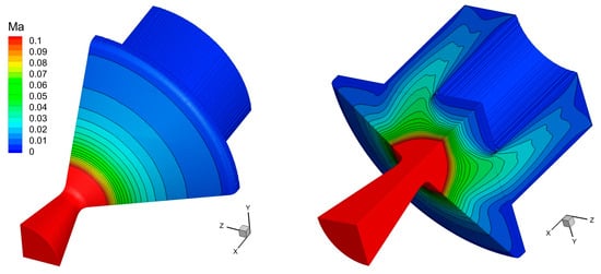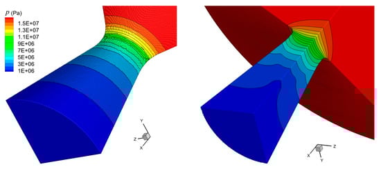 The quasi-static flow within a solid rocket motor refers to the flow while the combustion surface remains fixed. The quasi-static flow in the motor is calculated to verify the ability of the immersed boundary method to deal with all kinds of boundaries in the three-dimensional flow. The geometric model of the motor is shown in Figure 3, and the main dimensions are shown in Figure 4, where the unit of length is a millimeter. The end-slotted and end-burning propellant is commonly used in single-chamber dual-thrust solid rocket motors [49]. The initial boundary values of propellant parameters and flow field are shown in Table 1. According to the axisymmetric geometric characteristics of the flow field, a quarter of the flow field is taken as the calculated object. The shape of end-slotted and end-burning propellant is complex, the inner flow field has a large number of burning surface boundaries and the burning surface boundaries are both convex and concave. According to the calculation results of axisymmetric two-dimensional flow obtained by the immersed boundary method in reference [18], three sets of grids are used to calculate a three-dimensional flow field. The first one is a uniform grid, and the side length of each direction of a grid cell is 1 mm. The second one is also a uniform grid, and the side length of each direction of the grid unit is 0.5 mm. The third one is a local refinement grid; the side length of the mesh cell near the nozzle border is 0.25 mm, so the side length of the rest of the mesh cell is 0.5 mm, and the side length of each direction is equal. For the stable flow field calculated by the third grid, the pressure distribution in the nozzle region is shown in Figure 5, and the Mach number distribution in the combustion chamber is shown in Figure 6. The cloud map distribution characteristics on the periodic plane oxy and oxz are the same as those of the axisymmetric 2D flow field [18]. In Figure 7, the flow lines on the periodic plane are shown, which start from the burning surface, extend along the wall, and flow towards the outlet. In the nozzle area, the flow line is distributed against the wall, which reflects the “non-penetrating” characteristic of the boundary condition of the sliding wall. In the combustion chamber area, the flow line emanates vertically from the combustion surface and extends downstream, reflecting the Taylor–Culick flow characteristics. These distribution characteristics of the flow field and flow line prove that the immersed boundary method can deal with the corresponding boundary conditions effectively. Table 2 lists the equilibrium pressure calculated by the axisymmetric 2D model [18] and the 3D model simulation. The equilibrium pressure calculated by the 3D model is slightly larger than that of the axisymmetric 2D model, and the difference between the two models would decrease with the reduction of the grid scale. When the mesh cell near the nozzle boundary is refined to 0.25 mm, the equilibrium pressure difference is 0.8%, which proves that the calculation result of the three-dimensional immersed boundary method is accurate and reasonable.