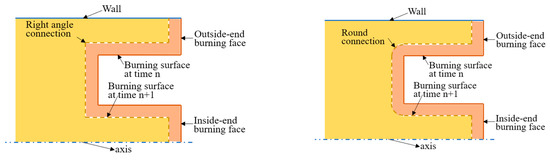 The initial values of the 3D transient flow field of the motor with end-slotted and end-burning propellant are listed in Table 1. The gas pressure distribution in the combustion chamber is uniform and also satisfies the geometric combustion law, which means the burning surface is assumed to be parallel regressed. In the axisymmetric 2D model [18], the simplified assumption is that the movement of the burning surface is interfacial advective motion, and the groove bottom surface of the propellant is always perpendicular to the adjacent cylindrical surface, just like the right angle connection, as shown in the left side of Figure 8. It is more reasonable to assume that the burning surface regression is the interfacial wave motion. In the regression process, a transitional curved surface would be generated between the groove bottom surface and the adjacent cylindrical surface, just as the round connection, as shown on the right side of Figure 8. In the three-dimensional model, the burning surface is regressed according to the wave motion, and the face offsetting method is used to simulate burning surface regression. When the end face of the end-slotted and end-burning propellant is burning, the radial size decreases gradually until it is zero, and the mesh on the end-burning surface is compressed violently. Because the original face offsetting method cannot remove the surface mesh cells, the mesh would go wrong when compressed by distance. The straightest way to handle this process is to perform a mesh cell merge. Jiao [27] changed the geometric features of the vertex at the junction of the conical surface of the propellant and the cylindrical surface of the shell wall from a ridge point to a smooth point. As the mesh is stretched on the cylindrical surface and is compressed on the conical surface, the vertex of the mesh at the junction moves towards the cylindrical surface in the smoothing process. The Jiao method is hard to implement because after the vertex of the junction is transferred to the cylindrical surface, the new vertex has to be determined and, after the mesh of the junction is smoothed, the boundary becomes blurred; moreover, the vertex of the junction is difficult to be determined. Therefore, instead of the Jiao method, another method is proposed to deal with the vertex of the junction in this paper. The vertex of the burning surface mesh that reaches the shell wall is set as a static point. That means not only the radial velocity but also the axial velocity is set to zero. Under such circumstances, the vertex on the conical surface would automatically stay on the cylindrical surface, which is equivalent to the mesh point on the compressed conical surface being transferred to the expanding cylindrical surface. For the convenience of subsequent description, this method is named the surface interface vertex transfer method, which is more efficient than the mesh merging method. The surface interface vertex transfer method is used to move the mesh vertex of the outside end-burning surface to the cylindrical surface of the shell wall, and the small triangular mesh of the inside-end burning surface is removed by the mesh merging method. Because the end surface of the propellant is a plane, the surface mesh merging on the end face almost does not affect the surface dispersion accuracy. In order to reduce the calculation time, the fluid domain mesh adopts a relatively sparse uniform grid, and the side length of the mesh cells is 1 mm. The whole process of burning surface regression would last about 1.17 s, and the number of fluid domain grids increases from 930,000 to 2.19 million. The calculation time is about 43 days using 56 cores on a dual-channel AMD EPYC 7452 computer (AMD, Beijing, China).