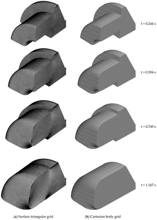 The methods of tracking the interface motion are divided into two categories: the Euler method and the Lagrange method. Euler methods include the level set method (LSM) [21,22,23], the Volume of Fluid (VOF) [24,25], and the minimum distance function (mDF) [26], which implicitly express the curved surface in a higher dimensional space. The advantage lies in its capability to accurately track the deformation and motion of complex interfaces, as well as effectively handle the interface evolution when the topological structure of curved surfaces changes. The disadvantage is that the three-dimensional volume grid is used to store the scalar representing the curved surface, so the calculation amount and memory space are large, and the precision of interface capture is lower than that of the Lagrange method. Lagrange methods include the marker particle method, the front tracking method, the face offsetting method [27] and the dynamic grid method. They can directly track the coordinate position of discrete points or surface elements in the process of interface deformation and movement. The advantage is intuitive and efficient. However, it is hard to deal with the intersection of discrete surface elements or edges, and basically, Lagrange methods cannot handle the changed topological structure during the evolution of curved surfaces. Currently, the most widely used methods for solving the burning surface regression are the minimum distance function method and the level set method [10,11,12,28,29,30,31]. If it is a case of parallel regression, employing the minimum distance function method enables the consideration of both efficiency and accuracy. If it is a case of non-parallel regression, the minimum distance function method is no longer applicable. Most researchers resort to utilizing the level set method and solving partial differential equations. The efficiency of the level set method can potentially be enhanced through certain techniques, but it does not necessarily guarantee an achievement up to the efficiency of the Lagrangian method.