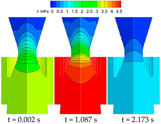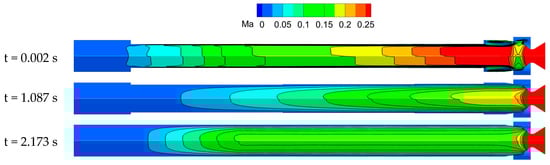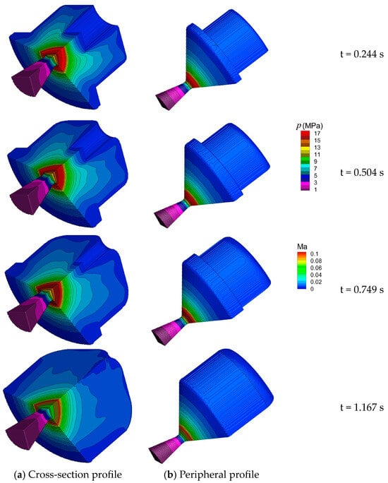 Figure 21 and Figure 22 show the Mach number cloud image of the combustion chamber and the nozzle pressure cloud image, respectively. In Figure 21, the size factor of the Y- and Z-axes is two times that of the X-axis. The Mach number distribution in the combustion chamber is consistent with the Taylor–Culick flow characteristics, but it is not the complete symmetry of the central axis, especially at the initial moment of 0.002 s. That indicates the mesh size is too large, and the accuracy of calculation results is not enough; thus, the mesh needs to be further refined. In Figure 22, the pressure distribution in the nozzle is basically symmetric about the central axis, and the distribution pattern is consistent with the flow characteristics of the Laval nozzle.