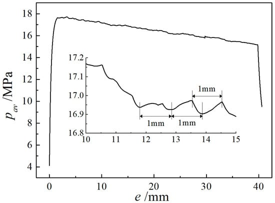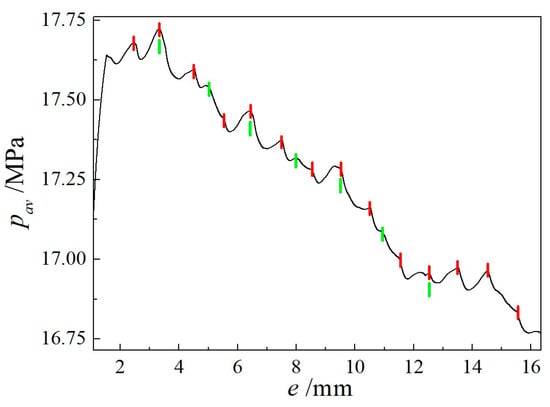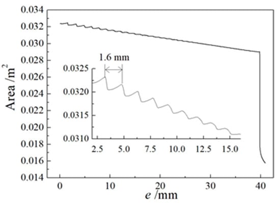 Figure 10 shows the evolution process of the surface grid and body grid in the combustion chamber and nozzle inlet area. It is clearly observed that the transitional curved surfaces between the groove bottom plane and the cylindrical surfaces (inner and outer) continue to grow. Figure 11 shows the evolution process in the distribution of pressure and Mach number on the flow field periodic surface and outer circumferential surface during the burning surface regression. The contour lines of pressure and Mach number are smooth and symmetrical about the central axis. At the moment of 1.167 s in the later period, as shown in the last two figures of Figure 11, the groove at the rear of the propellant burns to the end, the two circumferential surfaces disappear and only the bottom end surface and transitional surface are left. Then, the total burning surface area decreases sharply, the flow field changes from the original quasi-steady state to the obvious unsteady state and the Mach number distribution in the combustion chamber is different from that in the earlier period, which becomes chaotic. Figure 12 shows the change curve of average pressure in the combustion chamber with the regressing distance of the burning surface. As the wave interface motion model is used to describe the burning surface regression in the three-dimensional model, the groove bottom surface and the two circumferential surfaces no longer remain vertical during the regressing process but form a transitional arc, and the total area of the burning surface keeps decreasing. Therefore, different from the calculation results of the axisymmetric two-dimensional model using the interface convection motion model, no horizontal plateau appears in the pressure curve after the equilibrium pressure. The maximum pressure in the whole regressing process of the burning surface is 17.72 MPa when the regressing distance is about 3.3 mm, and it is very close to the peak equilibrium pressure (17.88 MPa) of initial quasi-static flow on the combustion surface, reflecting the accuracy of transient calculation results. In Figure 12, the local magnification map, corresponding to the regressing distance of 10~15 mm, reveals that one period of pressure fluctuation is about 1 mm, which is exactly the side length of the body grid unit. Therefore, the same conclusion [18] is obtained with the immersed boundary method in the axisymmetric two-dimensional flow simulation calculation, and the transformation of the grid unit type causes a small pressure fluctuation at low frequency during the implementation of the immersed boundary method. The pressure fluctuations are further analyzed, and the pressure curve with the regression distance between 2 mm and 16 mm is enlarged, as shown in Figure 13. The horizontal coordinate interval of the red vertical line is about 1 mm, and the interval of the green vertical line is about 1.6 mm, which is approximately equal to the fluctuation period of the burning surface area caused by the vertex transfer of the end burning surface grid to the shell wall, as shown in Figure 14. The amplitude of both pressure fluctuations is within 1% of the mean value. The above results show that the immersed boundary method and face offsetting method in this paper can be applied to achieve the transient simulation of the internal flow field in the whole process of the groove combustion of end-slotted and end-burning propellant. The calculation results of the flow field are reasonable, and the feasibility of the simulation calculation of the gas flow coupling with burning surface regression is verified when the two methods are combined.