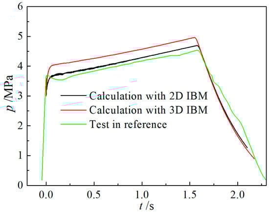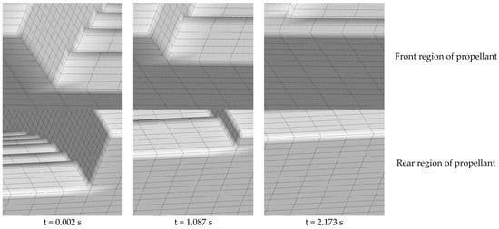 Figure 17 shows the change curve of pressure at the front of the combustion chamber over time. Compared with the calculation results [18] of the axisymmetric two-dimensional method and the experimental results [50], the accuracy of calculation results is reduced due to the application of large mesh size in the three-dimensional method. However, the overall change trend is consistent, and the pressure curve moves up about 0.3 MPa overall, indicating that the three-dimensional calculation results are reasonable and reliable. Compared with 2D, the 3D pressure curve is smoother and has no obvious burrs because the 3D flow field calculation results do not capture the vortex movement in the combustion chamber. Figure 18 shows the evolution of the surface grid of the fluid domain in the front and rear regions of propellant in the transient flow field. At 2.173 s, the front of the propellant is not completely burned out, and there is still a certain distance between the burning surface and the shell wall of the combustion chamber. The rear end of the propellant has been burned out, and the burning surface is the same height as the shell wall. Figure 19 shows the evolution of the body grid of the fluid domain in the front and back regions of propellant in the transient flow field. At 1.087 s, there are five body grid unit heights in the front region and only three body grid unit heights in the back region. Figure 20 shows the shadow pattern of the burning surface area from the view direction along the negative Z-axis. The lower boundary of the shaded area is the central axis, and the upper boundary is the Y-axis boundary of the burning surface. The size factor of the Y- and Z-axes is 21 times that of the X-axis. In the figure, the upper boundary of the burning surface gradually changes from a horizontal shape to an expanding shape tilted to the upper right, and the axial length decreases greatly in the later moment because the rear region of the propellant burns out first. The results, shown in Figure 18, Figure 19 and Figure 20, present that the immersed boundary method and face offsetting method effectively realize the simulation of non-parallel burning surface regression coupled with the gas flow considering the erosive burning in the solid rocket motor.