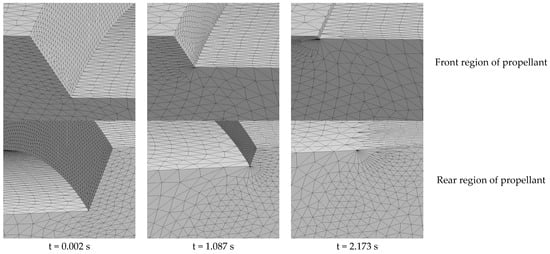 Evolution of the triangular surface grid in the front and rear regions of propellant.