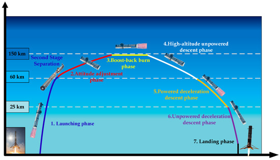 The reusable launch vehicle (RLV) represents a novel space transportation tool that incorporates minor modifications to the basic configuration of conventional launch vehicles, enabling it to possess the capability of landing and returning. This advanced system offers several advantages, including reduced requirements for landing sites, a smaller technological leap, and relatively lower research and development costs [1]. Typically, the RLV undergoes seven distinct flight segments, which include the active phase, attitude adjustment phase, trajectory correction phase, high-altitude unpowered descent phase, powered deceleration descent phase, unpowered deceleration descent within the atmosphere, and the landing phase, as illustrated in Figure 1. To effectively control the vehicle’s attitude during these varied flight stages, the RLV must coordinate the operation of various heterogeneous actuation systems, such as the swiveling engines, grid fins, and the reaction control system (RCS) thrusters [2]. The complexities presented by the extensive airspace and velocity envelopes, significant changes in dynamic characteristics, and high environmental uncertainties [3] during the entire flight mission make it challenging to establish clear and precise kinematic laws and mathematical models for the RLV. Consequently, the design of a high-precision and robust anti-interference attitude control system for the RLV, which is subject to the influence of multiple heterogeneous actuators, and the unified description of all flight stages within a single control framework, are pivotal research directions in the field of aerospace launch vehicles [2].