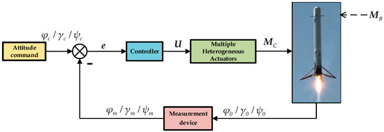 As a core function of the launch vehicle control system, attitude control utilizes data from sensitive devices, guidance signals, and navigation computations to generate control commands that manipulate the vehicle’s rotational motion around its center of mass. This ensures stable flight and effective command tracking even under various disturbances and potential faults [4]. As depicted in Figure 2, the attitude control system computes pitch, roll, and yaw angle commands (), which subsequently undergo meticulous comparison with instantaneous attitude telemetry furnished by a measurement device (); then, error signals () are generated. The controller, leveraging these error signals and tailored control algorithms, outputs control signals (), activating multiple heterogeneous actuators responsible for generating the requisite control moments () to effect dynamic compensation; this process rectifies and stabilizes the vehicle’s triaxial orientation (), guaranteeing in-flight stability and trajectory precision. Undoubtedly, the controller and multiple heterogeneous actuators are crucial to the effectiveness of RLV attitude control. Inaccurate or delayed attitude control during the vehicle’s return phase can lead to unsuccessful rocket recovery, which in turn affects the reusability and economic efficiency of the vehicle. Consequently, the selection of an appropriate control strategy and the design of a reasonable controller are crucial elements for the successful implementation of RLV attitude control.
