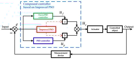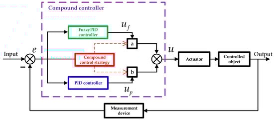 In response to this issue, this paper, based on the compound controller given in literature [23,25], the hybrid controller given in literature [13], and the dual-mode switching controller given in literature [22], designs a fuzzyPID–PID dual-mode compound controller, as shown in Figure 4. As depicted in Figure 4, this controller collaborates with both the PID controller and the fuzzy PID controller (shown in Figure 3) for joint control. It sets the appropriate working weight coefficients for the two controllers using the compound control strategy and sums the outputs of each controller after weighting to obtain the final output of the dual-mode compound controller. This approach combines the advantages of fuzzy PID and PID control methods, enhancing both the dynamic performance and the steady-state accuracy of the system, while avoiding the adverse effects of mode switching, thereby maximizing the performance of the controller.