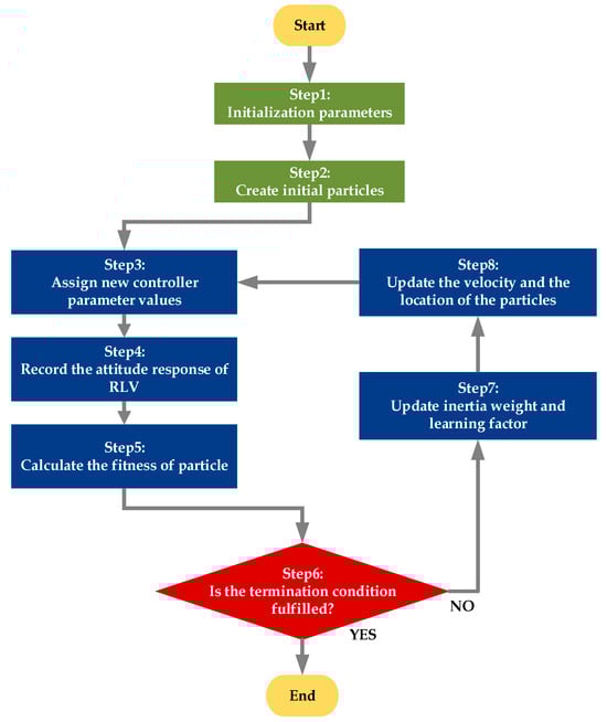 As illustrated in Figure 5, the optimization process begins with the system initializing parameters. After initialization, an initial population is randomly generated. The improved PSO algorithm records each particle as a controller parameter and calculates the deviation between the response result of the vehicle’s attitude angle and the target attitude angle. Based on the fitness evaluation function, the algorithm selects the best particle in the population. The algorithm then determines whether the particle meets the convergence condition (i.e., whether the response result of the vehicle’s attitude angle reaches the predefined target requirements) and whether it meets the iteration termination condition (i.e., whether it reaches the maximum iteration number). If the conditions are met, the particle is used as the working weight coefficients of the RLV dual-mode compound attitude controller. Otherwise, the algorithm updates the inertia weight and learning factors, continues the iteration based on the velocity and position update formulas of the particles, and seeks a better solution.