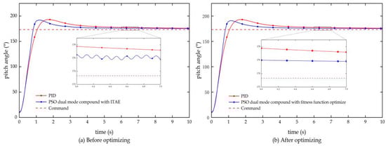 The dual-mode compound controller under the control strategy of the RLV is evaluated for fitness using Equation (20), with the pitch angle response curve of the attitude adjustment phase selected as the reference, as shown in Figure 7a. It is evident from Figure 7a that, although the dual-mode compound controller based on the improved PSO outperforms the traditional PID controller in terms of rapidity (convergence speed) and accuracy (error magnitude), the RLV’s attitude still exhibits slight oscillations during the response process and after the system stabilizes. Such response results are also considered unsatisfactory. This indicates that the ITAE evaluation index has a flaw in determining the fitness of the particles, i.e., it fails to identify the oscillation in the response curve, leading to poor system response stability.
