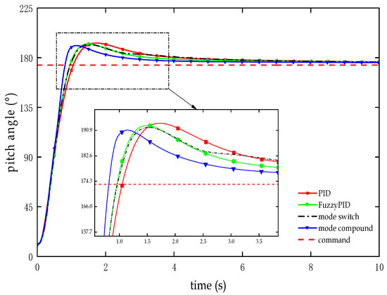 After the first and second stages of the RLV undergo thermal separation, the first stage of the carrier enters the return phase. To alleviate the attitude control pressure in subsequent flight segments, the vehicle body must perform a 180° attitude reversal and maintain a stable attitude for a certain period of time during the attitude adjustment phase [28]. Therefore, this paper selects the attitude adjustment segment with significant changes in the vehicle’s flight attitude for system step tracking comparative tests, which can better verify the control effect of the designed dual-mode compound controller.
