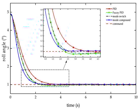 As illustrated in Figure 9 and Table 3, in the control of the RLV’s roll angle during the attitude adjustment segment, the dual-mode compound controller based on the improved PSO achieves effective control of the roll attitude; it not only preserves the zero-overshoot characteristic of conventional PID controllers, but also achieves a 34.57% reduction in adjusting time. While inheriting the rapid response of fuzzy PID controllers, it surpasses them with a 45.80% decrease in steady-state error. This controller demonstrates good stability, rapidity, and accuracy.