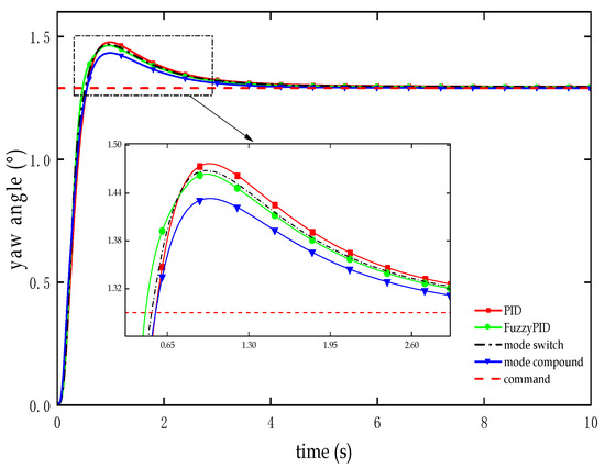 As indicated in Figure 10 and Table 4, in the control of the RLV’s yaw angle during the attitude adjustment segment, the dual-mode compound controller based on the improved PSO outperforms the other three controllers. It exhibits reduced overshoot of 15.21% to 21.20% and shortened adjusting time of 8.97% to 10.75% and eliminates steady-state errors; in contrast, non-zero steady-state errors persist with the remaining controllers.