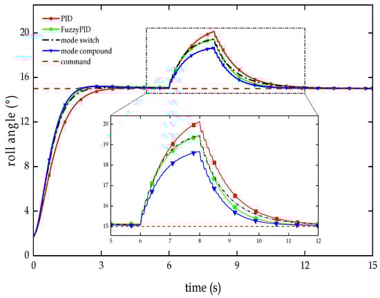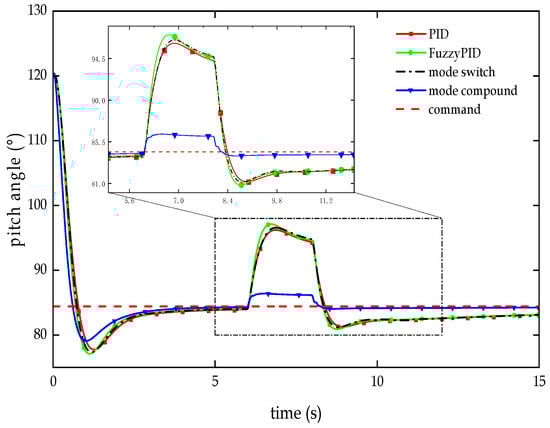 According to the flight state of the RLV’s unpowered descent segment within the atmosphere, the initial pitch angle of the vehicle body is set to 120.14°, the initial roll angle is set to 1.77°, and the initial yaw angle is set to 3.89°. The commanded pitch angle is 84.41°, the commanded roll angle is 15.00°, and the commanded yaw angle is 12.56°. After the simulation runs for 6 s, a pulse interference signal in the form of a disturbance moment is added to simulate the disturbances the RLV may encounter during flight. Figure 11, Figure 12 and Figure 13 show the anti-interference test curves of the vehicle body’s attitude angles in the unpowered descent segment within the atmosphere, and Table 4, Table 5 and Table 6 provide the corresponding anti-interference test indicators for the attitude angles.