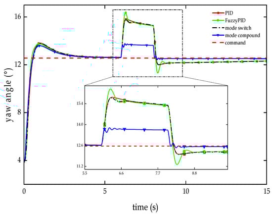 To further improve the control performance, it is common to study the combination of fuzzy control with various control methods, aiming to overcome the limitations of the basic fuzzy controller while effectively utilizing the advantages of fuzzy control [23]. In the literature [22], a dual-mode switching controller composed of a PI controller and a fuzzy controller was designed. This controller employs the fuzzy controller when the deviation is large, enhancing the system’s response speed, and switches to the PI controller when the deviation is small, eliminating the control blind spots of the fuzzy controller and improving the system’s steady-state accuracy. The dual-mode switching controller combines the strengths of both controllers, although it may lead to a frequent oscillation range at the critical point during mode switching [24,25]. If applied to attitude control of the vehicle body, the mode switching may introduce significant uncertainty in the response, leading to an unstable state of the vehicle body.