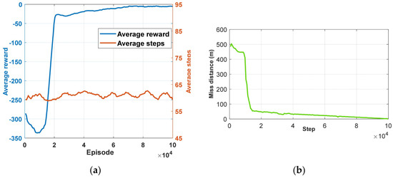 Training results. (a) Learning curves of reward and steps. (b) Miss distance of training process.