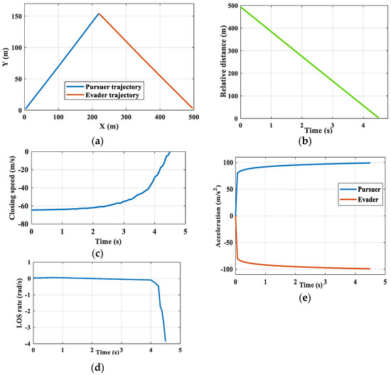 Figure 9a shows the trajectory of the pursuer and the evader. It is a game process where the pursuer and the evader are unwilling to lose their own interests. Thus, the interception paths appear to be straight. The change in the relative distances of two agents is presented in Figure 9b. It can be clearly noted that both results indicate that the pursuer can intercept the evader successfully. Figure 9c,d show the performance curves of the closing speed and the LOS rate. Figure 9c reveals that the closing speed converges to zero, which implies that the pursuer intercepts the evader as soon as possible. Figure 9d presents that the LOS rate is maintained at zero, which implies that the pursuer intercepts the evader with a parallel manner. It also keeps up with the interception characteristics of PNG. This result indicates that the motion direction of the pursuer and the target remains unchanged, and the paths appear to be straight. The acceleration curves of two agents are presented in Figure 9e, which reveals that the proposed guidance algorithm provides smooth guidance command within the limited acceleration range. It can be seen from Figure 9e that the accelerations of the pursuer and the evader approach the maximum amplitude within 0.1 s. Therefore, it can be concluded that the evader tries its best to escape from the pursuer, while the pursuer tries its best to intercept the evader, which reflects that the game process is an accelerated interception process.