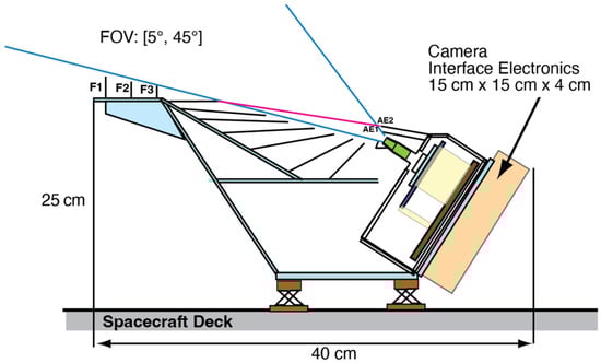Side view of the WISPR instrument showing the exterior (F1–F3) and interior baffles (AE1, AE2). The HTI is a modified version of the WISPR instrument on PSP capable of observing within 5° from the Sun’s center. HTI will perform >10× better than STEREO/HI-2 for the same solar elongations.