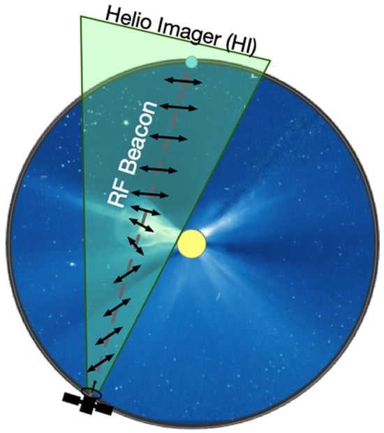 When linearly polarized radiation transverses magnetized plasmas, it undergoes rotation in its polarization plane. This effect, dubbed Faraday Rotation (FR) has been used for decades to remotely probe coronal and heliospheric structures (e.g., Levy et al. 1969 [8]; Kooi et al. 2017 [9]; and Figure 4 and Figure 5). FR is a particularly promising remote sensing technique to derive not only the strength but also the 3D configuration of the magnetic field in CMEs while they are still in the corona. This is a valuable capability for SWx operations, as the CME magnetic field is the dominant quantity in assessing a CME’s geo-effective potential. The rising interest in SWx impacts across the U.S. civilian and military sectors has renewed interest in FR studies and space applications [10,11].