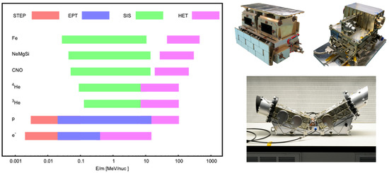 Candidate instrumentation for the SEP suite on SRM. Left: energy and ion species coverage of the EPD sensors. Right: Pictures of the flight units of STEP (upper left ©A&A), EPT-HET (upper right ©A&A), and SIS (bottom ©A&A) [15].