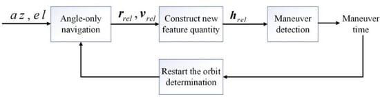 The basic logical relationship of the non-cooperative target orbit maneuver angles-only detection method proposed in this study is shown in Figure 1. First, the line-of-sight angle measurement (the azimuth az and elevation el) is filtered and estimated in combination with the dynamic model to obtain the relative position vector and relative velocity vector of the non-cooperative target. Then, the maneuver-detecting characterization (the relative angular momentum ) is constructed based on the relative orbit parameters. Finally, the maneuver time is determined through the inspection and discrimination of the characterization, and the process of determining the initial orbit is restarted at the same time.