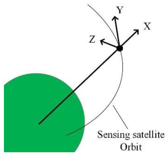 where the subscript e is used to denote the , , and , and is the direction cosine matrix from the LVLH frame to the geocentric inertial frame which can be calculated from the orbit position and velocity vector.
