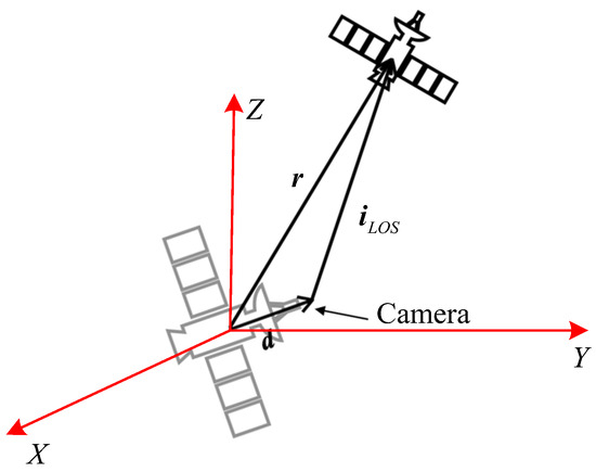 In this study, it is assumed that the orbit and attitude of the chaser satellite are known, and only passive optical cameras on the satellite can be used to measure non-cooperative targets. According to the engineering constraints, the camera is installed away from the chaser’s center-of-mass (COM), and the measurement is shown in Figure 3. The offset vector of the camera is denoted by in the LVLH frame. Then, the line-of-sight vector from the camera to the target in the LVLH frame can be modeled as follows: