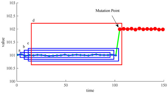 However, it is difficult to use the individual time point information to determine the true single mutation point because the fluctuating local information value caused by the measurement is very likely to be identified as the true mutation point. Therefore, we aim to use more information to characterize the data and make decisions to reduce this possibility. According to Equation (15), the information segments before the mutation point maintain the characteristics of continuous change, and they have a high correlation. However, when a certain information segment contains the mutation point, its trend changes, and thus the correlations between the information segments containing the mutation point information and all the previous information segments are very low. Using this phenomenon, we can divide the information into two types of segments with different characteristics: the information segments before the mutation point and the information segments containing the mutation point. For example, Figure 4 shows a group of virtual data containing a mutation point. The data before and after the mutation point satisfy Gaussian distributions, and a, b, c, and d are the information segments of four sequential sliding windows with equal widths. In Figure 4, we can see that although some local trends (the trends of any number of sequential points, but the number is far less than the total) of a, b, and c are different owing to noise, the overall trends are almost the same, i.e., a, b, and c have a high correlation. However, the overall trend of d is very different from that of a, b, and c (i.e., the correlation is very low). Therefore, we can divide information segment d into a different category from that of information segments a, b, and c.