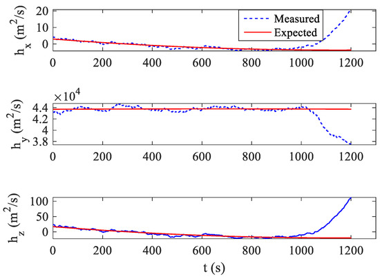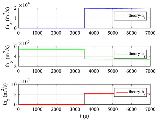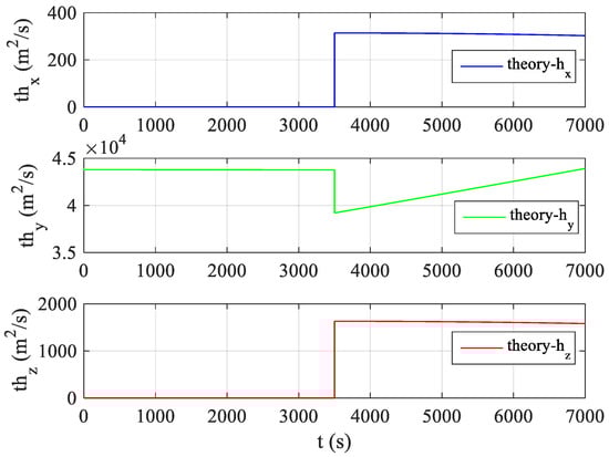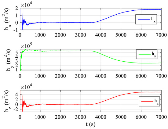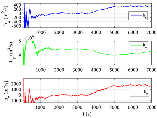 As shown in Figure 6 and Figure 8, the relative angular momentum exhibits an obvious mutation after maneuver which verifies that the relative angular momentum has very good observability for the target orbit maneuver. The changes in the relative angular momentum values in Figure 6 and Figure 9 are somewhat different after maneuvers because the filter for the estimation of relative position and velocity mentioned in Section 2.1 deals with the change caused by the orbital maneuver as noise, but they are generally similar and have the same characteristics. In Figure 6 and Figure 8, when there is no maneuver before t = 3500 s, the relative angular momentum exhibits a trend similar to a straight line after the filter converges smoothly. At t = 3500 s, the relative angular momentum in the Y-direction of the LVLH system has a larger mutation than the original foundation. After the mutation, the relative angular momentum values in the three directions tend to be a stable straight line. This shows that the relative angular momentum still has excellent observability for the orbital maneuvers of long-range targets when the noises are considered.