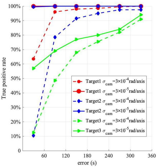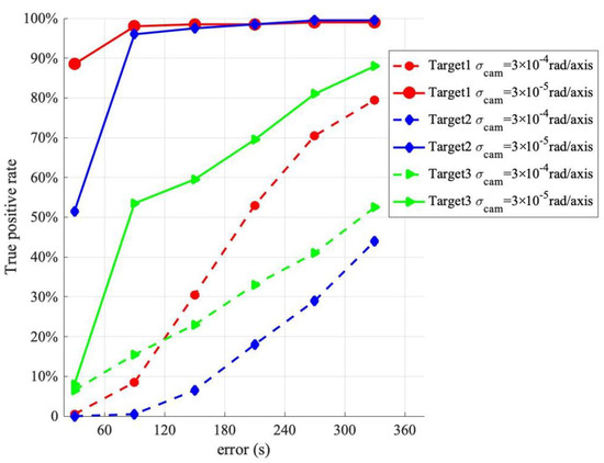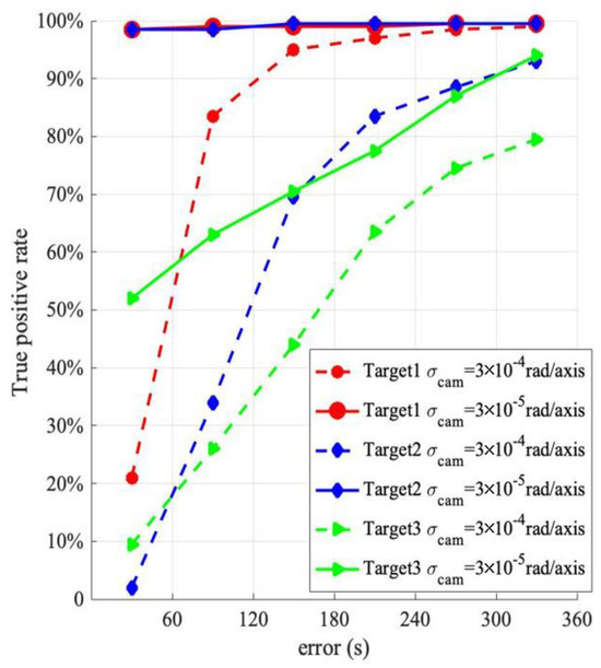 Figure 11, Figure 12 and Figure 13 also indicate that the maneuver magnitude has a significant influence on the performance. For small maneuvers (e.g., 0.2 m/s), the detection with the low-precision sensor is less effective, but it is more effective with the high-precision sensor. With the high-precision sensor, the detections of coplanar Target 1 and Target 2 are better than that of the heterogeneous Target 3. The true positive rate of Target 1 with a detection error of less than 60 s is 88.5% and that of less than 120 s is 98%. The true positive rate of Target 2 with a detection error of less than 120 s is 96%. The detection error of Target 3 is greater than that of the coplanar targets overall; however, for a detection error of less than 360 s, the true positive rate is 88%. When the maneuver magnitude is 0.6 m/s, the probability that the detection error of Target 1 and Target 2 is less than 60 s reaches 98.5%, and the true positive rate for a detection error of Target 3 of less than 360 s increases to 94%. When the maneuver magnitude reaches 1.0 m/s, the probability that the detection errors of Target 1 and Target 2 are less than 60 s is close to 100%. This shows that the method proposed in this study requires a high-precision measurement sensor for small maneuvers; otherwise, the detection performance will be reduced or lost. For large maneuver magnitude cases, the detection error of the high-precision measurement sensor is smaller overall. However, if the magnitude of the detection error is not considered, but only whether the target orbit maneuver is detected, there is little difference in the detection true positive rate. In this case, a low-precision measurement sensor with a lower cost can be selected.