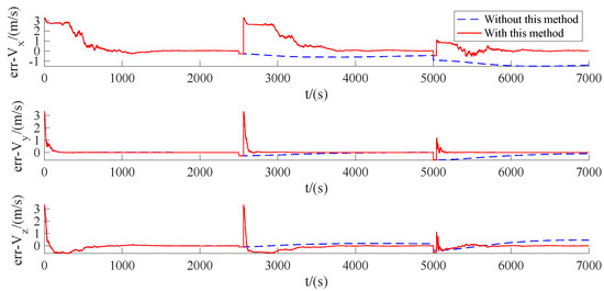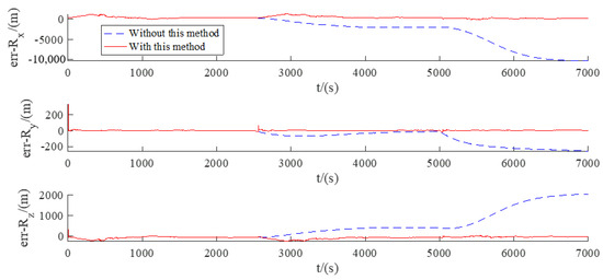 The results of the estimated error of the relative position and velocity are shown in Figure 14 and Figure 15. It can be seen that both the maneuvers are detected, and the detection error is quite small. In detail, the first maneuver detection result is t = 2579 s with an error of 79 s, and the second detection result is t = 5058 s with an error of 58 s. After the filter is restarted, the estimation error is going to converge and then keep convergent, as indicated by the red curves. In contrast, the blue curves presenting the errors without the proposed method are divergent after maneuvers.