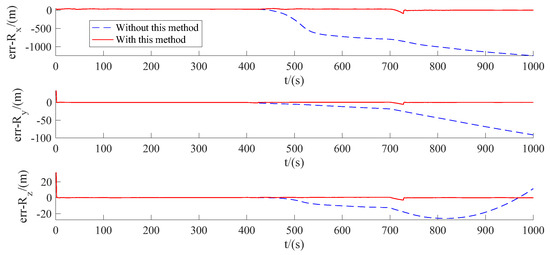The continuous tracking performance for a close-range target initialized in a V-bar stationary orbit (which is considered as the most disadvantageous trajectory for angles-only navigation) is tested. There are two randomly directed impulses executed at t = 500 s and t = 700 s with the magnitudes of 0.1 m/s and 1 m/s, respectively. The results are shown in Figure 16 and Figure 17, where the red curves present the estimated errors with the proposed method and the blue curves present the errors without the proposed method. It can be seen that the maneuvers are detected and the estimate error is convergent after the restarting of the filter when each maneuver is detected. The errors of the two detection results are 23 s and 29 s, respectively.