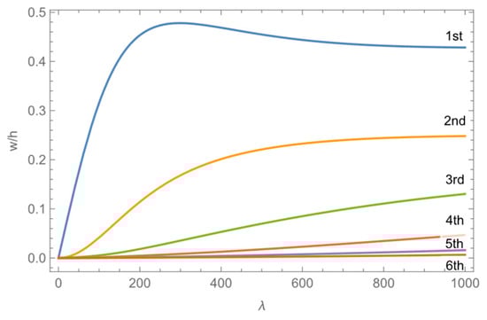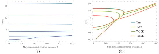 In this section, linear analysis is conducted for the FG plate in Case 1 using the first six Ritz orders. Figure 14a illustrates the relationship between the dynamic pressure and flutter frequency for each order at a Mach number of Ma = 5, a temperature increase of ΔT = 20 K of each order experiences different changes. Low-order frequency changes are more pronounced, while the first-order frequency gradually increases, and the high-order frequency slightly decreases. At a dimensionless dynamic pressure of 424, the first two orders of frequency coincide, and the eigenvalues of the first two orders of the system transform from two real roots into a pair of conjugate complex roots, thus inducing panel flutter. This is due to the mutual coupling between different orders of aerodynamic forces in the spatial correlation term in piston theory. This coupling results in the higher-order term providing additional aerodynamic stiffness for the lower-order term, improving the lower-order natural frequencies. Similarly, the lower-order term weakens the aerodynamic stiffness of the higher-order term. As the dynamic pressure increases, the frequency of the first coupled orders becomes the lowest-order term and increases with increasing dynamic pressure, while the higher-order dynamic pressure decreases with increasing dynamic pressure. The nondimensional frequency can be defined as the ratio of the frequency to the first-order natural frequency of ceramic plates, ω0, as