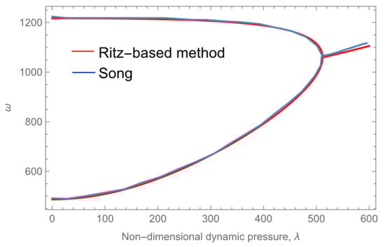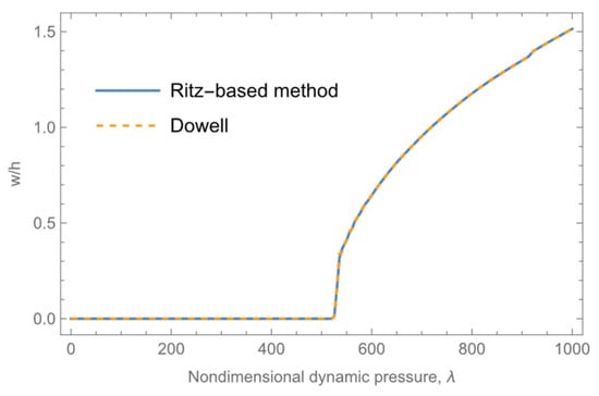 First, the results of the Ritz-based method in this study are compared with those of Dowell’s method [2] at a dimensionless mass-to-Mach number ratio of μ/Ma = 0.01 and Mach number of Ma = 5. The relationship between the limit-cycle amplitudes and dynamic pressure of the ceramic plates when k = 0 in Case 1 is depicted in Figure 17. The results of this study resemble those of Dowell, indicating the accuracy of the method used in this study.