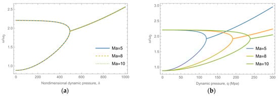 In order to investigate the influence of the Mach number, Figure 15 show the variation of flutter frequencies with the nondimensional dynamic pressure and the actual dynamic pressure under various Mach numbers, respectively. It can be observed that the flutter characteristics are independent of the dimensionless dynamic pressure, as the Mach number is already accounted for in the nondimensionalization, which is also shown in Equation (49). In contrast, the flutter characteristics are dependent of the actual dynamic pressure. The flutter dynamic pressure is higher at the higher Mach number when the dynamic pressure is dimensional.