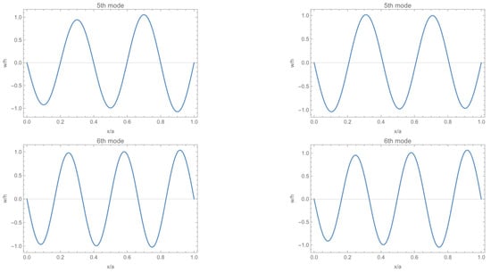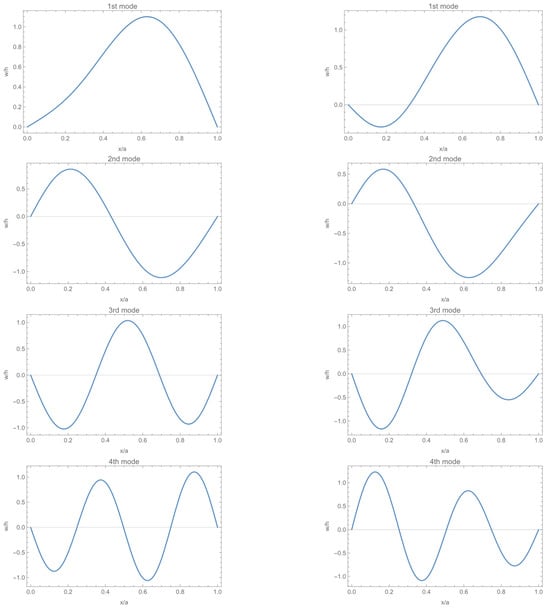 As in Dowell’s calculation in [2], the effect of the geometric nonlinear term can be expressed in energy form as shown in Equation (23), where A, B, C, D, E, F, and G are integration coefficients. The specific expression is shown in Equation (A5) in Appendix A, where EFGM is the equivalent elastic modulus of the FGM: