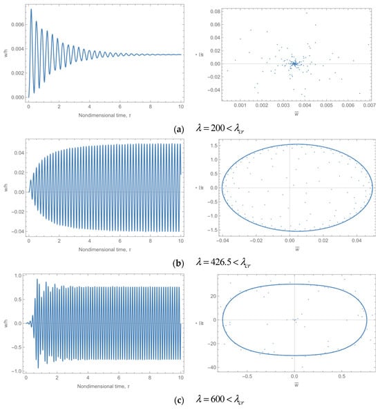 However, the system is unable to dissipate the initial perturbation energy. Consequently, the perturbation gradually accumulates and increases, resulting in the displacement and velocity of the representative coordinates converging to those of the limit cycle at λd = 426.5. The system response then moves slowly from the center of the phase diagram to the outside and ultimately reaches the limit cycle. As the pressure increases, the amplitude of the limit cycle also increases because of the geometrically nonlinear effect of the structure. As the deformation becomes larger, the stiffness increases, which restricts further amplitude expansion. The system begins with a slight amplitude vibration near the equilibrium position. The system response swiftly expands from the center of the phase diagram to the limit ring and ultimately converges.