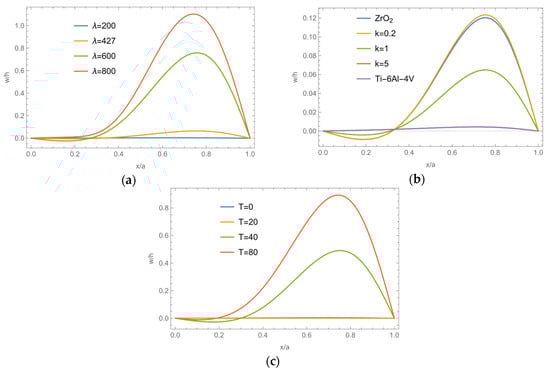 Deformations of the FG plate at representative coordinates under different cases: (a) different nondimensional dynamic pressure; (b) different volume fraction indexes; (c) different temperature increases.