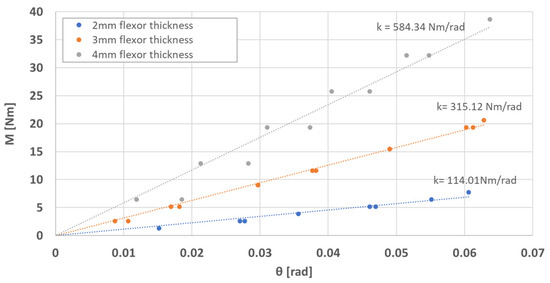 Figure 4 was obtained by loading the model with calibrated weights and reading the pitch angles of the model with an inclinometer which has the maximum error allowed under 0.033°. Also, the stiffness values of the flexor system were estimated in an FEA (finite element analysis) and the difference between the FEA estimation and the measured values of stiffness was below 1%.
