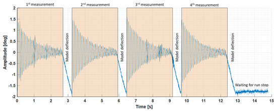 The test starts with the model locked at the maximum pitch angle to avoid the oscillations induced by the start-up loads. When the total pressure of the flow is established, the rod of the actuation system is retracted, releasing the model to oscillate in flow conditions. After approximatively 2.5 s, the rod is pushed by the rig’s actuator, deflecting the model at the maximum pitch angle; then it is rapidly retracted, releasing the model to oscillate in flow conditions. This action is performed four times, then the model is deflected at the maximum pitch angle while waiting for the run to stop.