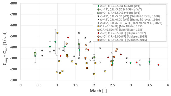 The variation in the pitch damping coefficient with the angle of attack (Figure 8) is performed only for small incidences (up to 5°) because at higher incidences the pitching moment became so large that the model was deflected on maximum position without oscillating. To evaluate the pitch damping coefficient at higher incidences, flexors with higher stiffness are necessary. The 5° AoA was tested only in the subsonic regime, where the pitching moment is significantly lower compared to the supersonic regime, where the angle of attack was limited to 3°. Even if this analysis does not present many tests, the performed ones were enough to validate the rig and to identify the pitch damping coefficient at non-zero incidences. The obtained results showed small differences with respect to the reference data due to the different testing parameters such as the Reynolds number, roll angle, and center of rotation. However, the obtained results respect the variation tendency and indicate values in good agreement with the reference data.
