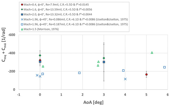 The reference data considered for comparison belong to the papers [10,25], and are available only for two supersonic regimes, Mach = 1.5 and Mach = 2. In order to analyze the effect of the angle of attack on the pitch damping coefficient, three regimes were performed: Mach = 0.4, Mach = 1.6, and Mach = 2.0.