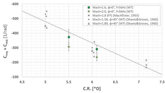 Figure 9 presents the variation in the pitch damping coefficient with the center of rotation, comparing the obtained results with reference results from ballistics tests [6] and wind tunnel tests [9]. In order to evaluate the effect of the center of rotation (C.R.) on the pitch damping coefficient, two regimes were considered (Mach = 1.6 and Mach = 2.0). The reference data are obtained for Mach = 1.58 and Mach = 1.89 in wind tunnel testing [9], and for Mach = 1.8 in ballistic testing [6]. The testing parameters of the reference data are not fully known and it can be observed that the roll angle of the model tested in [9] differs from the roll angle of the model used in this study.